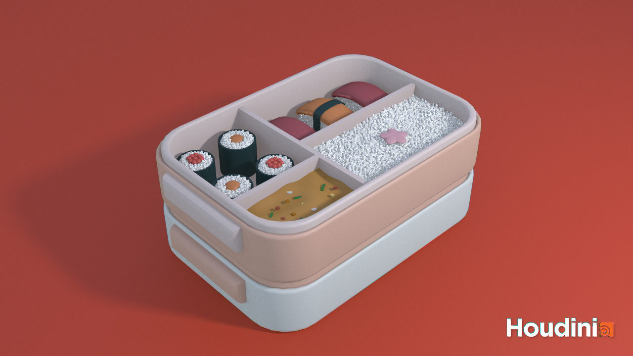 A procedural generator that creates customizable 3D bento boxes with randomized layouts and food items in Houdini. I collaboratively worked on this as my final project for CIS 5660: Procedural Graphics at Penn.